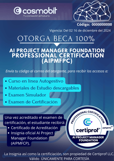Cosmobit, comprometido con el desarrollo profesional, otorga becas para la certificación AI Project Manager Foundation Professional Certification de CertiProf, fortaleciendo sus habilidades en la gestión de proyectos mediante inteligencia artificial.